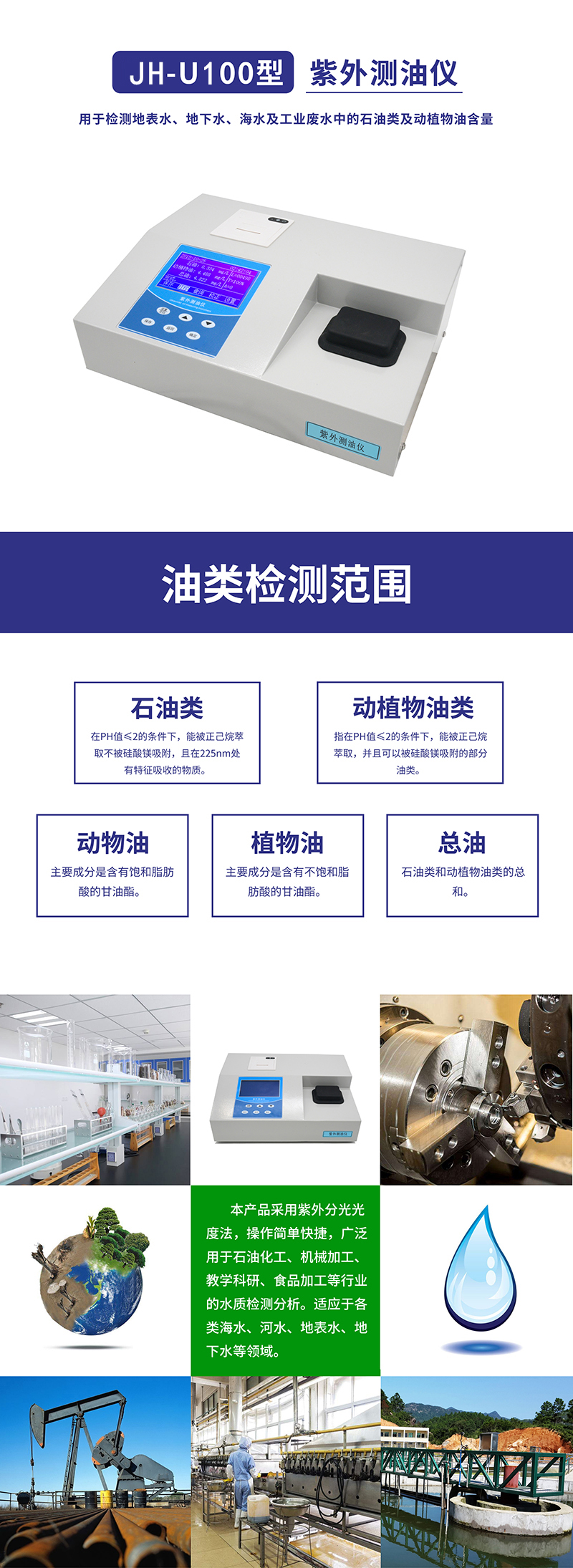 JH-U100型紫外測油儀是我公司依據(jù)國家環(huán)境監(jiān)測技術(shù)規(guī)范要求,結(jié)合我國環(huán)境污染狀況及各*環(huán)境監(jiān)測部門的需要而研發(fā)出的一種高效、環(huán)保、精準(zhǔn)、快捷的測油儀器,它用正己烷萃取劑替代紅外法中已被禁用的四氯化碳萃取劑,符合新國標(biāo)《HJ 970-2018 水質(zhì) 石油類的測定 紫外分光光度法》的要求,該產(chǎn)品操作簡單、精密度好、靈敏度高、性能穩(wěn)定,能滿足用戶的各種應(yīng)用需求。