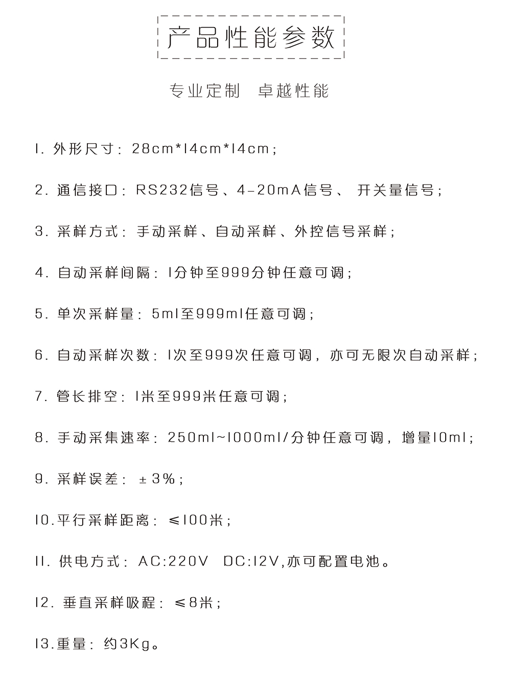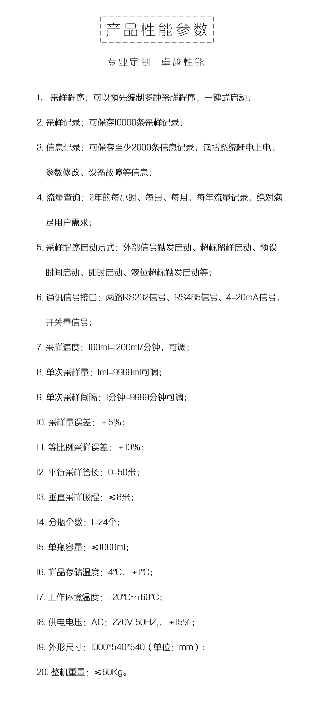 儀器采用可靠蠕動泵,混合式步進機驅(qū)動,滿足各類環(huán)境條件下的水質(zhì)采樣。適用于各*環(huán)境監(jiān)測站、污水處理廠、水利、水務(wù)及科研院所,對工業(yè)污水排放口、江、河、湖、海等水樣的采集。