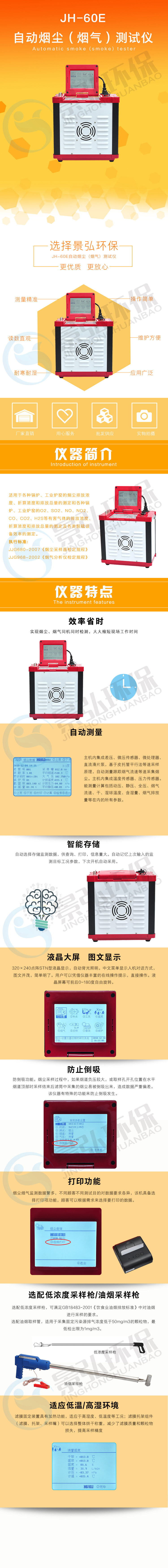 JH-60E型自動(dòng)煙塵(氣)測試儀是依據(jù)國家檢定規(guī)程JJG680-2007《煙塵采樣器檢定規(guī)程》JJG968-2002《煙氣分析儀檢定規(guī)程》,吸取國內(nèi)外同類儀器之優(yōu)點(diǎn)的智能型煙塵煙氣測試儀,該機(jī)技術(shù)性能指標(biāo)符合國家環(huán)保局頒布的煙塵煙氣采樣儀的有關(guān)規(guī)定,實(shí)現(xiàn)煙塵、煙氣同機(jī)采樣及檢測,大大縮短現(xiàn)場工作時(shí)間。適用于各種鍋爐、工業(yè)爐窯的煙塵排放濃度、折算濃度和排放總量的測定和各種鍋爐、工業(yè)爐窯的O2、SO2、NO、NO2、CO、CO2、H2S等有害氣體的排放濃度、折算濃度和排放總量的測定及各類脫硫設(shè)備效率的測定。