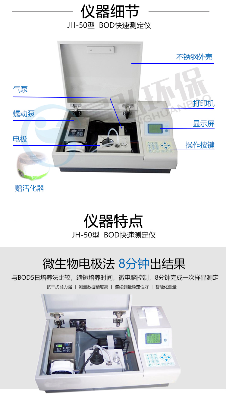 JH-50型BOD快速測定儀采用微生物電*法,能快速測定水樣中的BOD值,而且操作簡便,測量準確。其原理基于微生物對有機物的耗氧代謝,測定BOD只涉及到初始氧化速率,因而可在8-15分鐘內(nèi)完成一個樣品的測定。大大縮短了測定所需的時間。該方法符合《水質(zhì)生化需氧量(BOD)微生物傳感器快速測定法》(HJ/T86-2002),在2002年出版發(fā)行的《水和廢水檢測分析方法》(第四版)列為A類方法。